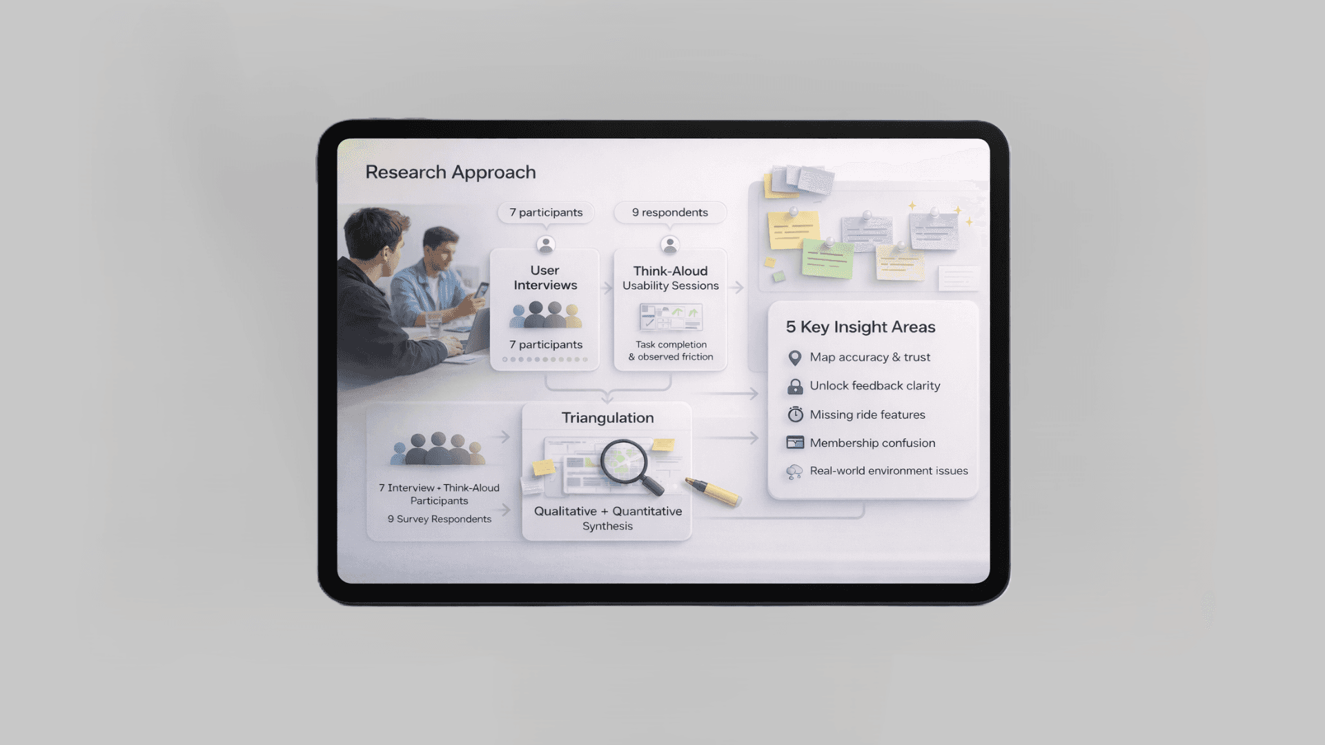 Led a team through a mixed-methods evaluation combining semi-structured interviews, think-aloud usability sessions, SUS surveys, and heuristic analysis with Nielsen's 10 principles. 7 participants, 9 survey respondents, 5 key insight areas.